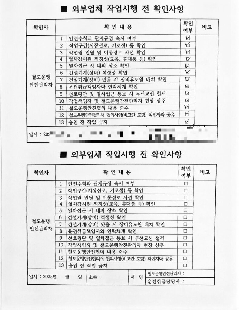 추가로, 위와 같은 작업시행 전 확인사항을 작성해야 하는 역도 있습니다. 작성을 하고 아래 협의서를 서명하여 작업현장을 가게 됩니다.