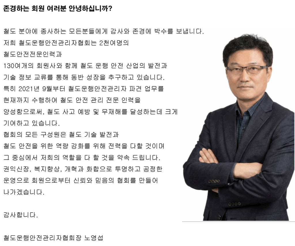 철도운행안전관리자협회는 전 회원이 일치 단결 하여 그동안 철도에서 쌓아 온 열차운용 기술과 안전 관리 경력을 바탕으로 철도를 이용하시는 국민들께 안전한 철도를 약속함으로써, 우리나라 철도 안전 분야에서 선봉장이 될 수 있도록 최선을 다할 것을 약속드리오니 끊임없는 관심과 아낌 없는 성원을 부탁드립니다. 감사합니다.