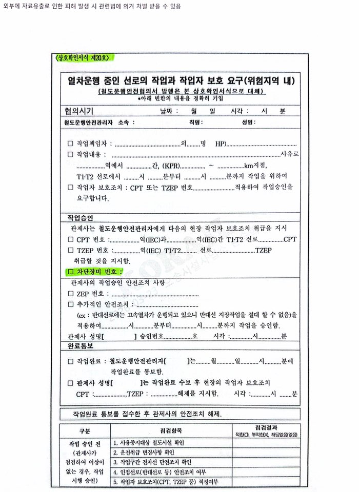 철도운행안전관리자 운전명령서식 제20호 작성방법에 대해서 알려드립니다. #차단작업 위험지역 (외측선로로 부터 2M 이내) 작업을 할경우 사용하는 서식입니다. #고속선에는 유지보수 업무를